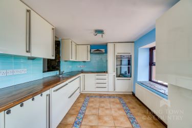 Kitchen 5.51m x 2.59m with a range of fitted units and a step leading down to the