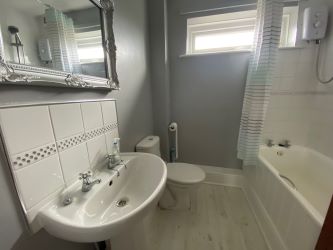with shower over bath, wash hand basin and WC