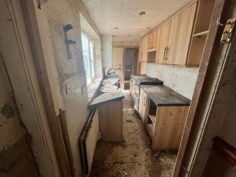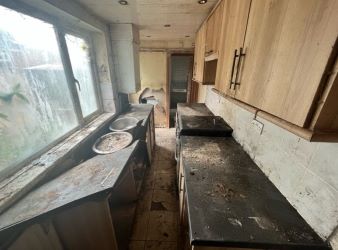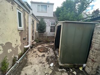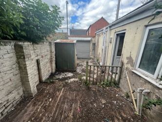 Vacant two-bedroom terraced dormer bungalow requiring renovation.