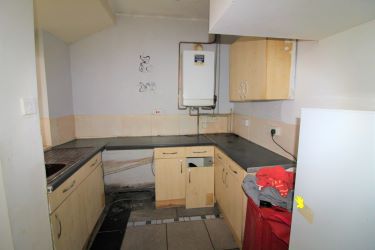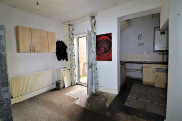 A spacious open area with a double glazed window and composite door to the rear garden , double glazed window , radiator , wall mounted gas boiler and fitted cupboards to the kitchen area.