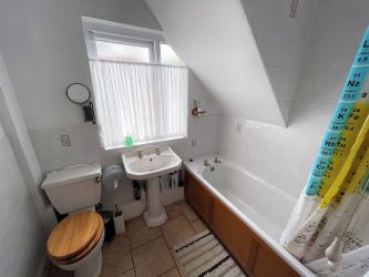 Ground Floor Bathroom Bath with electric shower over.  Pedestal wash hand basin.  Low level W.C. Double glazed window to the side.