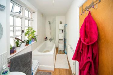 Window to the rear, bath with shower over, wash hand basin, extractor fan, WC and part tiling.