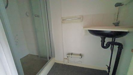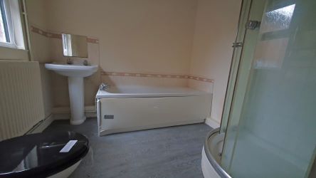 With radiator, enclosed shower cubicle with shower over, wash hand basin, and extractor fan.