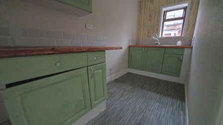 With UPVC double glazed window to front aspect, coving, range of wall and base units with roll top work surfaces, tiled splashback, sink and drainer unit, gas cooker point, extractor hood, and power points.