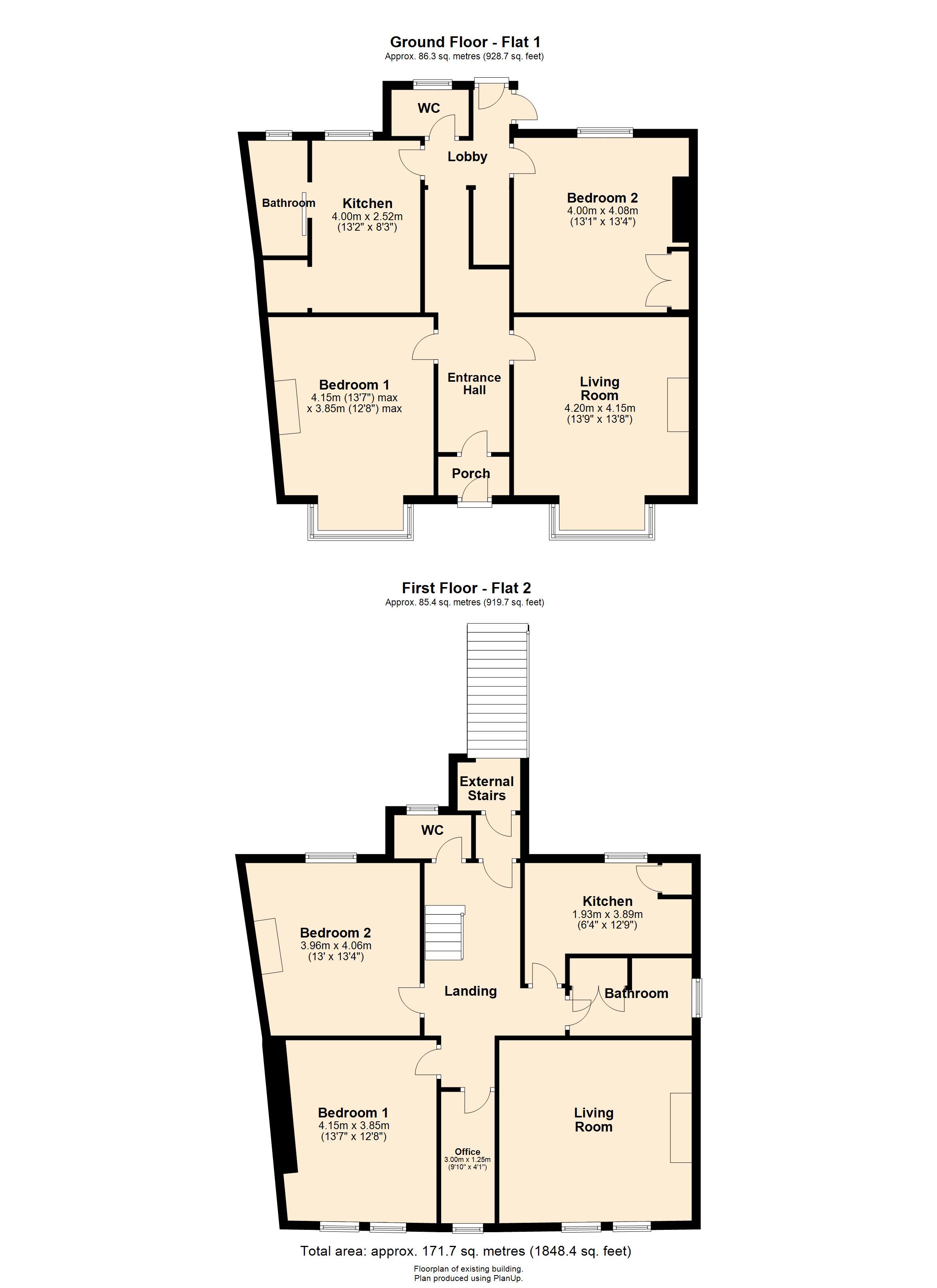 The first-floor unit is accessed via a separate external staircase at the rear of the property and comprises; Hallway; Living Room; Kitchen; 2 Bedrooms; a Bathroom and a separate WC.