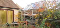 The front garden is predominantly paved with various shrubs and side access to the fenced rear garden with two greenhouses and a detached garage.