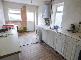 Base cupboards, built in oven and hob, plumbing for washing machine, two UPVC double glazed windows and rear door, combi gas central heating boiler.