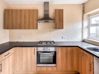 A range of base and wall units with complementary roll edge work tops over, stainless steel sink and drainer, gas hob with oven below and extractor fan over, space and plumbing for appliances.