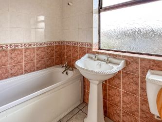 White 3 piece suite comprising of panel bath, low level flush WC, pedestal wash hand basin, radiator, fully tiled to walls and floor.