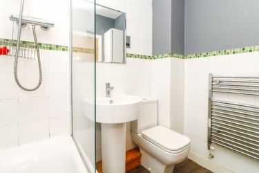 A modern three piece suite in white comprising low level W/C, wash hand basin, panelled bath with shower over, tiled walls and a heated towel radiator.