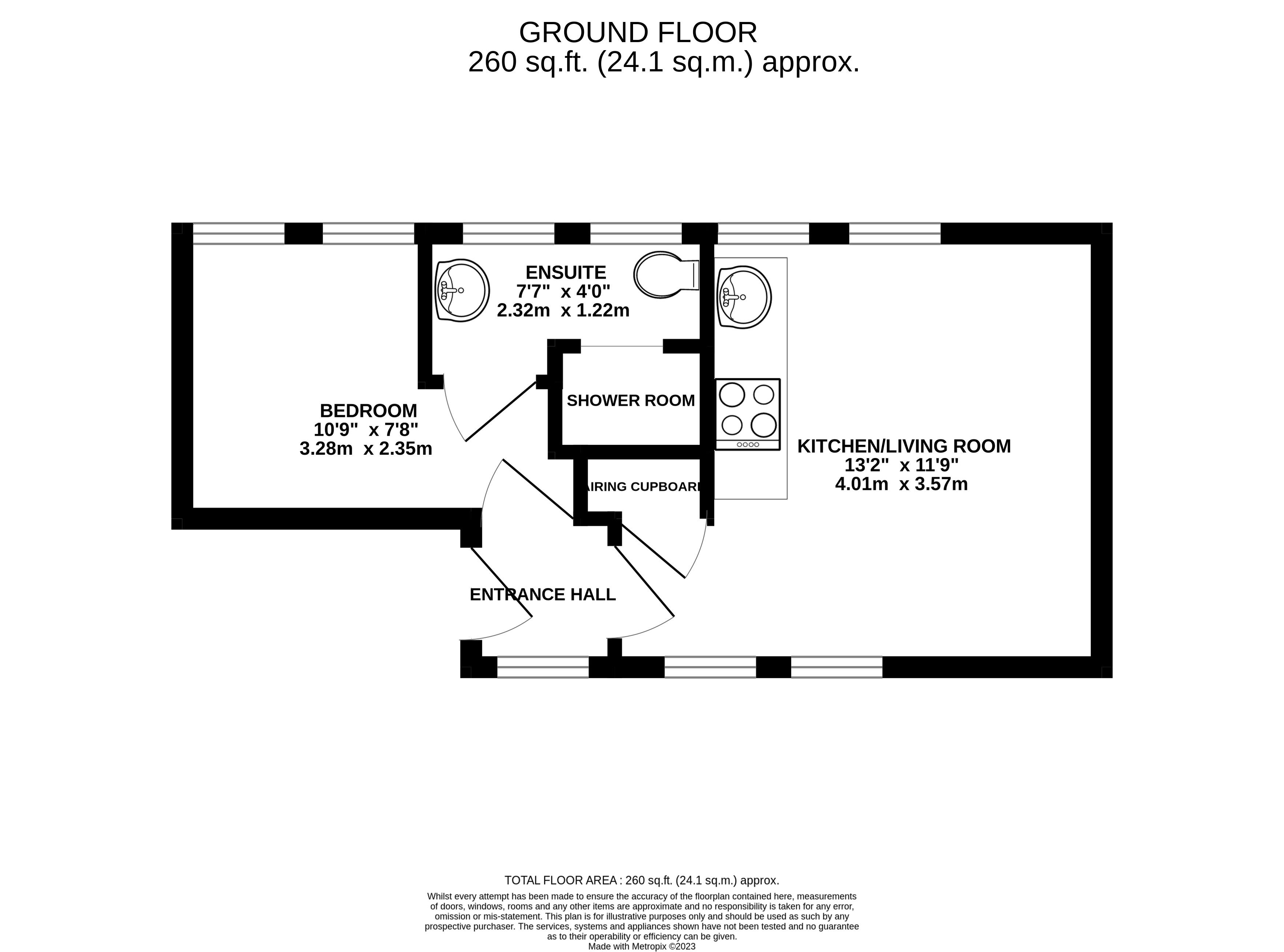 With double height ceilings and large windows throughout the bright apartment, there is a small Entrance Hallway, an open-plan Kitchen-Living Room, a double Bedroom, and an En Suite Shower Room.