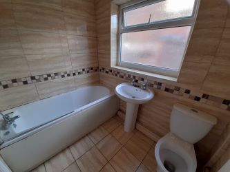 UPVC double glazed window to the rear elevation, three-piece bathroom suite comprising WC, pedestal wash hand basin, panel sided bath with shower attachment, tiled walls and flooring and radiator.