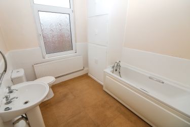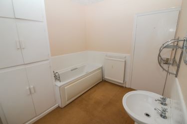 A large bathroom which has a modern white suite with shower taps to the bath, a built in storage cupboard , two radiator and an extractor fan