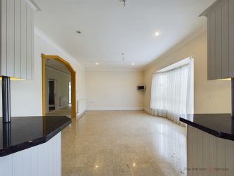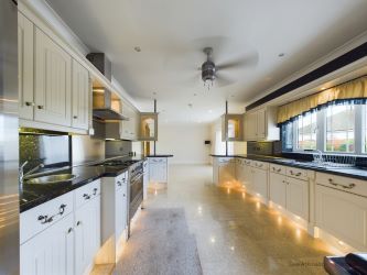 Fitted with an extensive range of units with granite effect worktops, two inset sinks, three quarter-size range oven and extractor, American style fridge, an integrated dish washer and microwave, tiled floor, dining area with bay window and TV point.