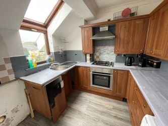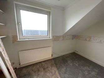 Spacious top floor, two bedroom flat, set within a popular residential area, which is well located for amenities and transport. A security controlled communal entrance leads to each of the flats in the block. A reception hall leads to each of the main rooms and has a storage cupboard. The lounge is a bright and spacious room with wonderful open city views over Glasgow. Double doors from the lounge lead into a dining area, currently utilised as a bar. The dining area leads into the kitchen which is fitted with floor and wall mounted units providing excellent storage and workspace. The bathroom is fitted with a suite and wall mounted shower. There are two bedrooms, one of which has been split into two with a partition wall between them; the bedroom with window and recessed wardrobes, and a storage area between the bedroom and the hall. The flat features double glazing, gas central heating and storage. Home Report Value: £70,000.